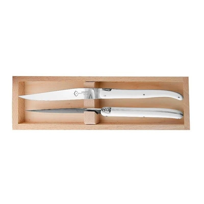 Parfait pour offrir en guise de cadeau, ce coffret vous fera profiter de 2 couteaux de table d’exception, conçus et fabriqués en France par Laguiole G.David. Ils se démarquent par leurs manches en POM coloris blanc, un matériau offrant une très bonne ergonomie et durabilité. Les lames elles, bénéficient d’un tranchant lisse précis et sont fabriquées en acier inoxydable, avec en guise de décoration le motif Arbalète Laguiole G.David. Les 2 couteaux ne sont pas adaptés au lave-vaisselle et sont livrés dans un joli coffret en bois. Existe aussi en version POM noir, à retrouver sur le site.