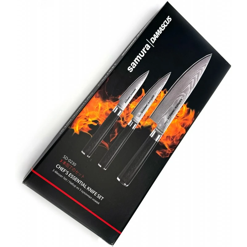Ce coffret Damascus Samura est un somptueux assortiment de trois couteaux de cuisine japonais. Il inclut :