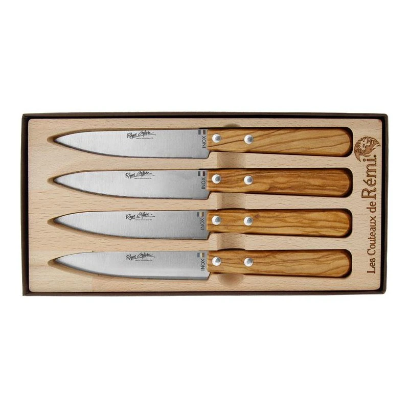 Sublimer sa table, c’est facile avec ce joli coffret contenant pas moins de 4 couteaux de table conçus et fabriqués en France par Roger Orfèvre. Les couteaux de table sont tous identiques, et munis d’une lame microdentée en acier inoxydable ainsi qu’un beau manche riveté en bois olivier. La lame microdentée permettra de facilement trancher tous les aliments, elle est marquée par le logo Roger Orfèvre, ainsi que par le type d’acier, ici l’inox, ainsi que par le drapeau tricolore Français. Ce coffret composé de 4 couteaux de table Roger Orfèvre en inox/olivier fera à coup sûr très plaisir aux gourmets. Avec eux, il sera possible de déguster de bons repas et aliments avec style et élégance. Ne pas passer les couteaux de table au lave-vaisselle.