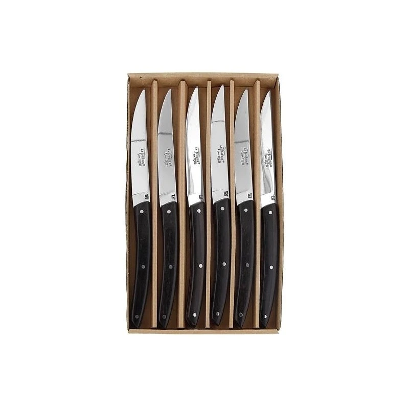 BJB est une coutellerie française implantée dans le bassin Thiernois, à l’origine de ce coffret de 6 couteaux de table Le Thiers. Tous sont dotés d’un manche en bois ébène à la teinte sombre ainsi qu’une lame de 11cm en acier inoxydable Z40C13 à la finition brillante. Non seulement performants au moment de passer à table, ils sont également très agréables à regarder ! Les lames sont marquées de l’inscription « Le Thiers par BJB », les couteaux ne sont pas compatibles avec le lave-vaisselle. Livrés en coffret cartonné.