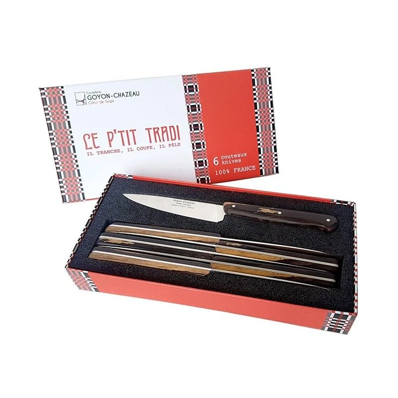 Le coffret de 6 couteaux Le P’tit Tradi Goyon Chazeau est l’essence même de l’excellence artisanale. Chaque couteau est minutieusement confectionné à la main, offrant ainsi une qualité de coupe incomparable qui ravira les amateurs de cuisine les plus exigeants.