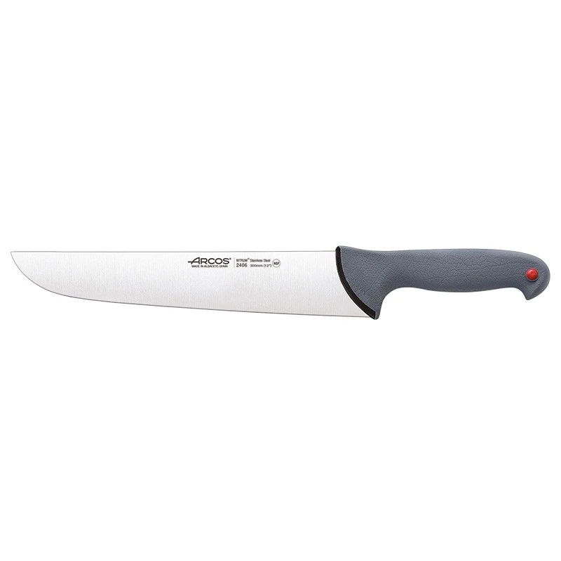 Ce couteau de boucher A240600 appartient à la série Colour Prof du fabricant Espagnol Arcos. C’est le couteau utilisé par les bouchers professionnels, en raison de sa grande lame large et solide, de 30cm de long, en acier inoxydable Nitrum très performant. Il faut mentionner que la lame résiste parfaitement bien à la corrosion/rouille, elle se personnalise par gravure (voir bouton ci-dessous). De quoi faire un très beau cadeau à un boucher de profession ou apprenti !