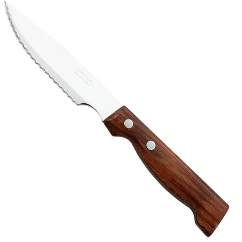 Ce couteau de table Arcos tranche les viandes cuites, et notamment les steaks, grâce à sa lame dentelée. Les crans permettent une coupe plus franche des viandes épaisses ou résistantes, sans les écraser ni les tirer.
