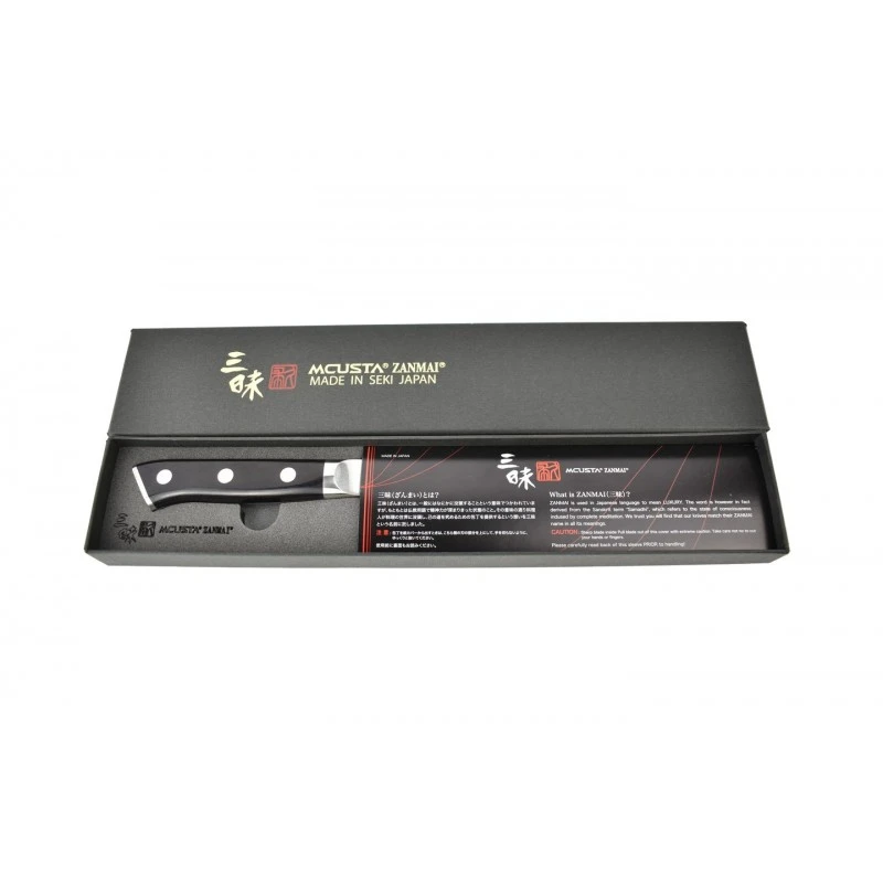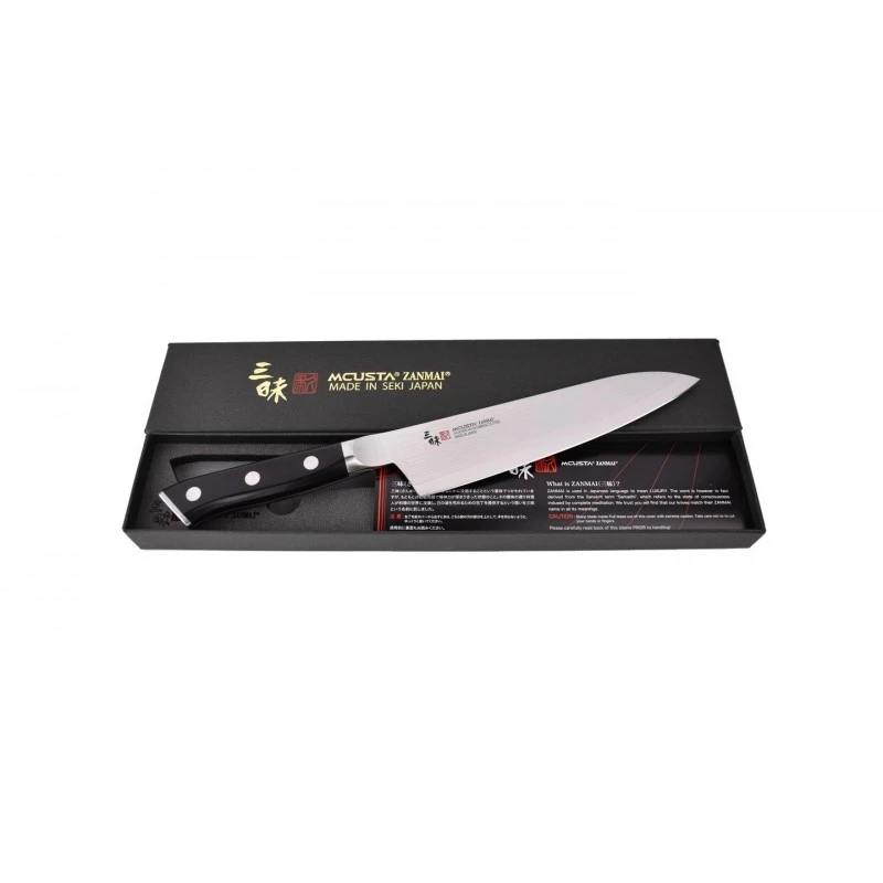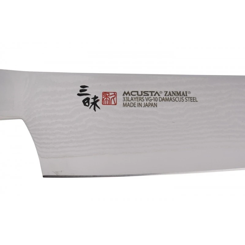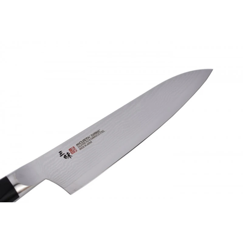 Le modèle Mcusta HKB3004D correspond à la version lame de 18cm du couteau de chef Japonais, dit Gyuto, appartenant à la série Classic Damas. Comme vous l’aurez compris, il possède une lame de 180mm de longueur, toujours fabriquée en acier Damas 33 couches avec noyau en VG-10 pour le tranchant (dureté d’environ 61HRC). De très haute qualité, la lame permettra au chef de cuisine, professionnel ou non, de pouvoir trancher nettement et sans effort tous les types d’aliments. Bien sûr, on retrouve le logo Mcusta (coutellerie Japonaise) ainsi que l’inscription Mcusta Zanmai juste à côté. Ce couteau Gyuto Classic Damas, par Mcusta, existe aussi avec une lame plus grande, de 21 ou 24cm de longueur. Vous les trouverez via les accessoires conseillés en bas de page.