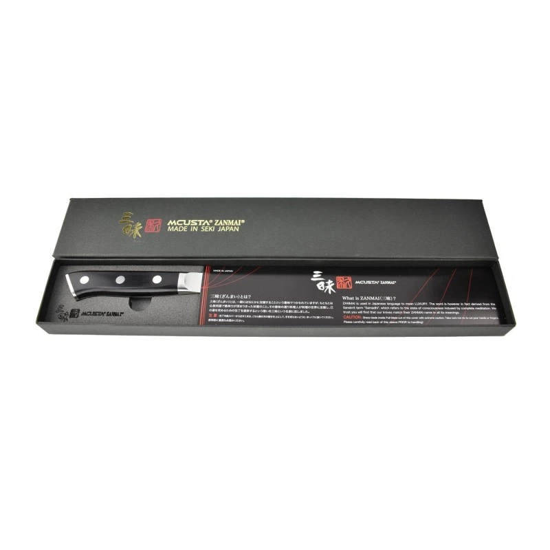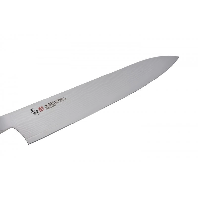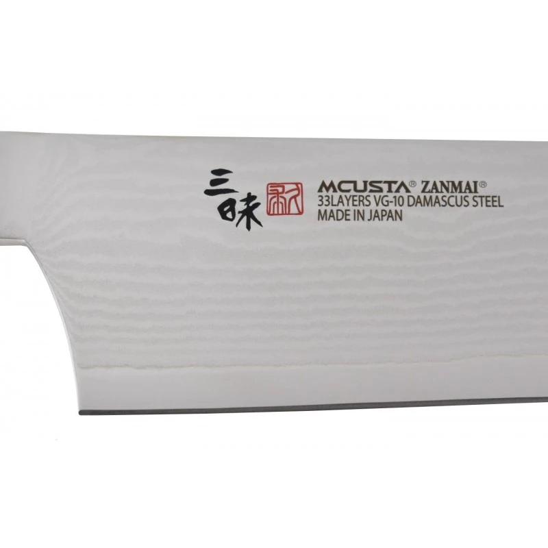 Quand on est un chef de cuisine professionnel, on ne plaisante pas avec la qualité de ses ustensiles, notamment couteaux. Voici justement un couteau de chef Japonais, dit Gyuto, par Mcusta, qui vous assistera avec brio lors de toutes vos découpes. Aucun aliment ne résistera à sa puissante lame de 24cm de longueur, fabriquée en acier damas San Mai 33 couches, avec un cœur en VG-10 poli à la main. Marquée par le logo Mcusta Zanmai, la lame est à la fois esthétique et performante, elle est de la forme caractéristique du couteau Japonais Gyuto.