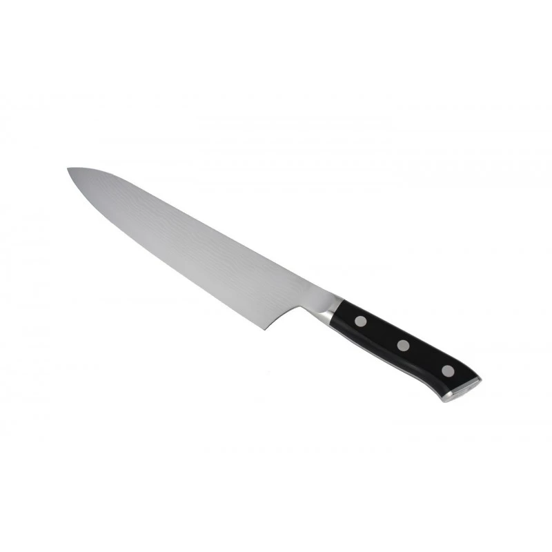 Porteur de la référence HKB3007D, ce couteau de chef Mcusta Classic Damas vous éblouira également par son manche noir en bois pakka, ainsi qu’en acier inoxydable (notamment les rivets). On remarque assez facilement que le manche a été sculpté avec le plus grand soin, avec un niveau de complexité des détails rarement atteint (polissage jusqu’à une finition miroir). En plus d’être magnifique, stylé, le manche joue également parfaitement son rôle avec une prise en main toujours agréable, même en cas d’utilisation intensive. Couteau Gyuto Mcusta fabriqué à 100% au Japon.