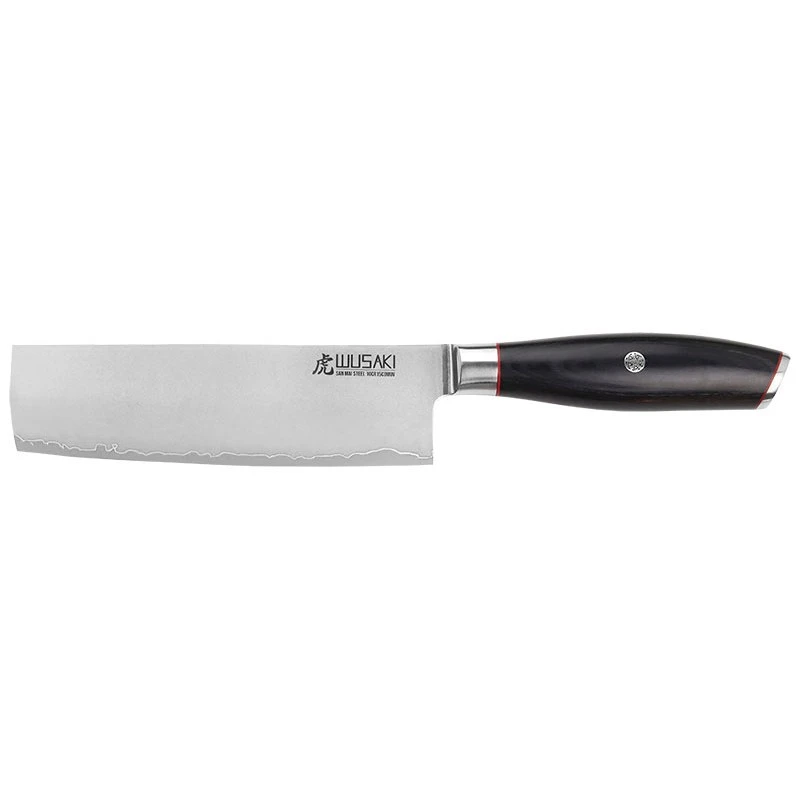 Emblème de la précision en cuisine, le couteau Nakiri est spécialement conçu pour une découpe fine des légumes. La marque Wusaki présente sa création de la série San Mai 10Cr15 : une lame de 17 cm au style couperet, sublimée par le logo Wusaki discrètement positionné dans le coin supérieur droit. Cette lame est magnifiquement complétée par une mitre brillante, menant à un manche bombé en pakkawood d’une élégante teinte sombre. Un allié incontournable pour les amateurs de cuisine qui recherchent à la fois esthétique et efficacité.