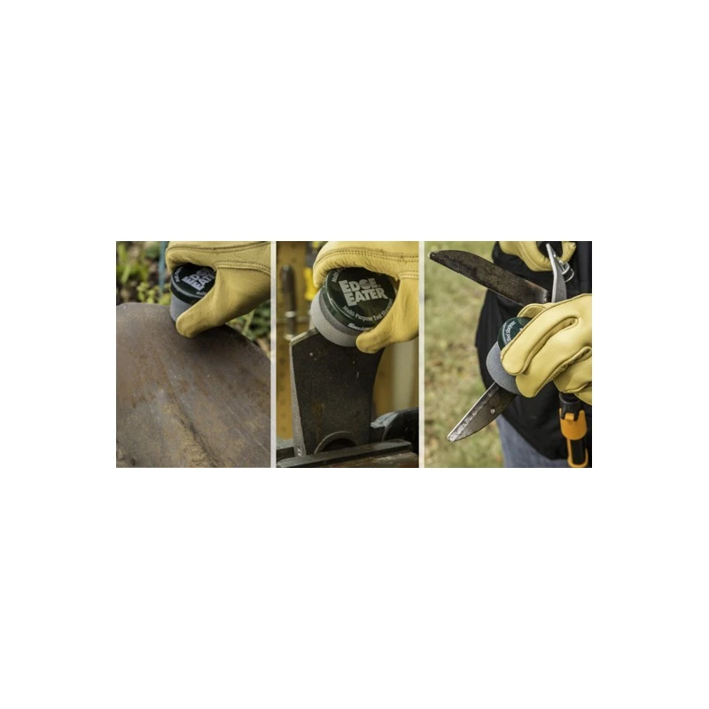 Le Edge Eater est une pierre à affûter manuelle conçue par la marque Smith’s. De forme ronde, elle est très utilisée pour affûter les outils de jardin (pelles etc …) par exemple, ou encore les haches et machettes, les lames de tondeuses et bien d’autres encore. Elle est très polyvalente et c’est là toute la clef de son succès. Le grip apporte énormément de confort et le bouchon protège la main lors de l’affûtage des outils. La forme ronde ne doit rien au hasard, c’est une question d’ergonomie, cela permet d’affûter plus rapidement et surtout plus efficacement. Le Edge Eater de Smith’s va faciliter considérablement l’affûtage de vos outils, essayez le et vous allez rapidement l’adopter ! En plus, il possède un nom percutant que vous ne risquez pas d’oublier !