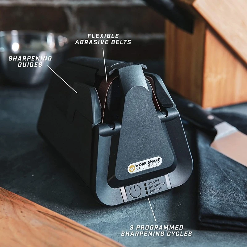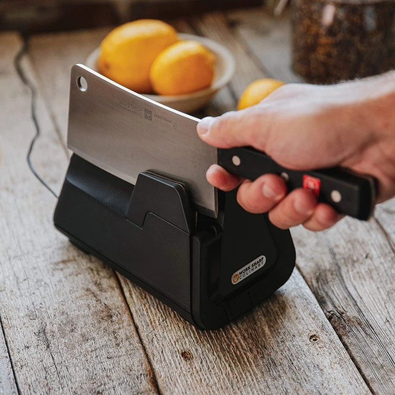 Vous ne vous sentez pas à l’aise avec un appareil manuel pour affûter vos couteaux ? Alors tournez-vous vers un aiguiseur électrique comme ce modèle de Worksharp. Il suffit de presser un bouton pour enclencher l’affûtage. Un jeu d’enfant ! Spécialisé dans les couteaux de cuisine, cet appareil réalise un aiguisage professionnel, comme celui pratiqué par les fabricants de couteaux, grâce à la flexibilité des bandes abrasives. Celles-ci possèdent un grain 120, moyen-fin, ni trop doux ni trop agressif, qui prolongera vos couteaux en bon état. Cet affûteur électrique E4-I Worksharp détermine l’angle d’affûtage idéal, dispose d’un guide et de trois cycles pré-définis, minutés en fonction de la forme du couteau. La poussière engendrée par l’aiguisage est absorbée par un aspirateur intégré. Quelle que soit la marque de votre couteau de cuisine, son type d’acier et de tranchant (lisse, dentelé), cet appareil en fait son affaire !